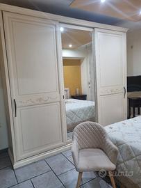 camera da letto arte povera completa di letto a cassettone tappezzato colore beige con poltrona beige tenda 2 comodini i comò ribaltabile porta tv armadio 6 ante scorrevole con specchio.