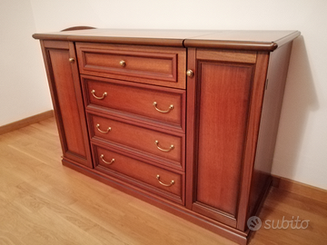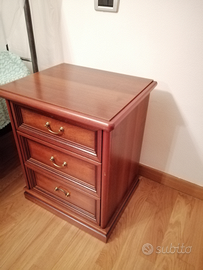 Vendo causa trasloco il seguente mobilio: armadio a 6 ante (di cui 2 con specchiera esterna), settimanale a cassettoni e 2 ante laterali con piano rialzabile come da foto, comodino, specchiera, il tutto in noce tanganica impiallacciato, armadio tamburato.