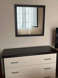 la camera da letto comprende un letto matrimoniale, due comodini, un como con tre cassetti e specchio e un armadio a cinque ante.