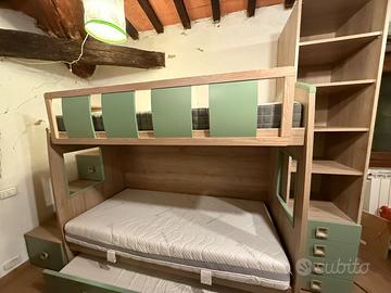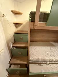 Vendo camera da letto per bambini. Composto da un letto castello con 3 letti, una scala che funziona come contenitore, una libreria e un armadio. Altezza armadio e letto con libreria 228cm, profondità 97cm il letto e 58,5cm il armadio. Il mobile deve essere smontato e si vende senza i materassi. Per altre misure chiamare Giorgio: 3284919311