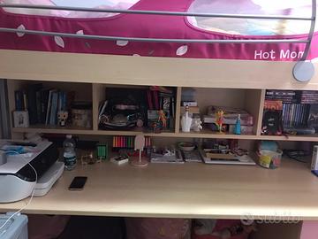 Letto singolo soppalco con testiera e ringhiera di protezione circostante; materasso in bultex sfoderabile e lavabile, tre “scalini contenitore” per accedere al letto soppalco.