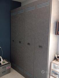 Vendo per cambio arredamento camera per ragazzi, letto una piazza e mezza, senza rete e materasso, completa di base letto con cassattone, comodino e armadio 170*232cm 4 ante, colore grigio. Smontaggio e trasporto a Vs carico, per il trasporto ci sono due piani di scale agevoli senza ascensore.
