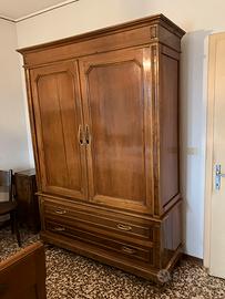 Camera da letto composta da: letto matrimoniale, 2 comodini, armadio e comò con specchio. In stato discreto. Impiallacciata in legno. Trasporto a carico dell’acquirente. Possibile anche ritiro dei pezzi singoli.