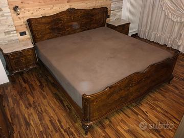 Camera da letto in legno di radica anni '50 stile Chippendale con piani in marmo composta da letto, 2 comodini, specchiera, como', armadio 5 ante, puff e 2 poltroncine. Solo pagamento in contanti al ritiro da parte dell'acquirente