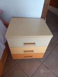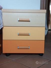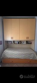 Camera da letto per ragazza composta da armadio a ponte con letto dotato di 2 ampi cassettoni ( materasso escluso ), cassettiera a 3 cassetti con ruote e libreria da muro con 3 scaffali colorati. Misure: armadio mm 206x565x260; letto mm. 201x90; libreria mm 100x285x575; cassettiera mm 505x423x575 ( h. cassetto mm 85 ). Tranne la cassettiera, gli altri elementi sono tutti smontati, rimane a carico dell'acquirente la spesa per il trasporto ed il successivo montaggio. Prezzo trattabile.