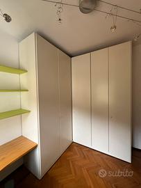 1 armadio ad angolo di 90 gradi di col.bianco panna (e’ un pezzo unico) mis.150 una parete e 180 l’altra x60 di profondità e 330 d’altezza,l’interno e’ attrezzato di ripiani,cassetti e aste appendiabiti molto capiente a €400.
