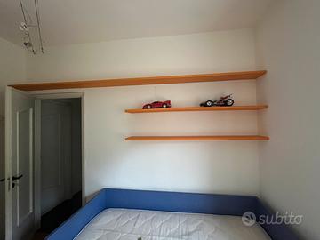 5 mensole colorate (2 verde acido uguali mis.160x36 come lunghezza scrivania + 3 arancio 1 mis.350x36 e 2 mis.180x36 sopra il letto a €100.