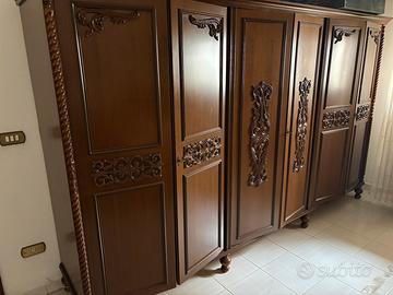 Vendesi elegante set per camera da letto in stile classico/barocco, caratterizzato da raffinati dettagli artigianali e finitura color noce lucido. I mobili sono in ottime condizioni e ideali per chi cerca un arredamento dal fascino senza tempo o per progetti di restyling. Il set comprende: * Letto Matrimoniale: Testata e giroletto decorati con fregi floreali a rilievo e colonne laterali a tortiglione. ( misura 180 cm x 210 cm); * Coppia di Comodini: Dotati di 3 ampi cassetti ciascuno, con pomelli in legno tornito e piedi a cipolla. (misura 56 cm x 64 cm); * Settimanale con dettagli a tema; * Cassapanca . Dettagli Tecnici: •Stile: Barocco/Classico con lavorazioni a spirale e intagli. • Stato: Ben conservati, struttura solida e cassetti scorrevoli. • Materiale: Legno con decorazioni applicate.