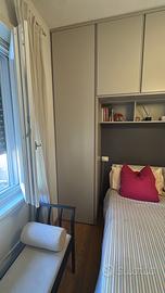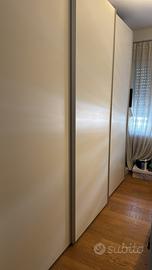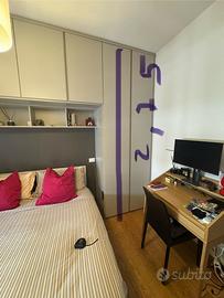 Camera da letto completa di: letto (contenitore) Misuraemme modello Thai, mobile falegnameria su misura capientissimo, guardaroba Misuraemme ante scorrevoli legno tamburato. Smontaggio e trapsorto a carico. Regalo scrivania come da foto. Vendo anche sepatamente