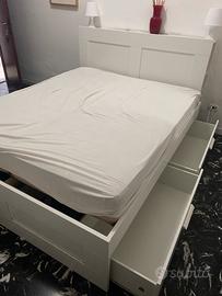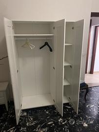 Struttura letto matrimoniale a doghe con testiera e cassettiera. Armadio tre ante con specchio. Più regalo materasso di colore bianco ed in perfette condizioni ,ritiro a carico dell’acquirente