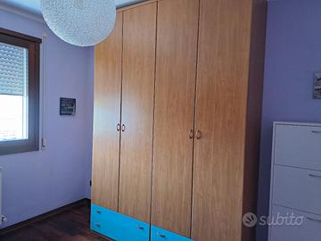 Vendo camera da letto per letto da 1 piazza e mezzo..Letto da 1/2 piazza, esclusa rete e materasso. No Ikea.In noce chiaro prodotta artigianalmente.Armadio a 4 ante piu' mensole porta oggetti e porta libri molto ampie.Ideali per uno studente.Mobile letto lunghezza 2.50 metri.Armadio lunghezza 1.80 metri.Tavolo 105 cm.