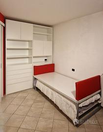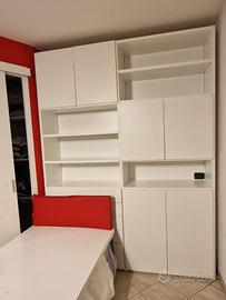 Camera da letto formata da un mobile libreria bianco, doppia colonna in melaminico con frontali laccati con 4 ante h. 62 + 2 ante h. 69 + 4 cassetti + cestone, altezza 260 cm. larghezza 195,5 cm. e profondità di 42 cm.