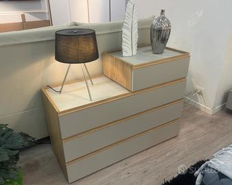 - Comò linea "Modo" suddiviso in base 3 cassetti L.1187 x P.488 x H.662 mm e sopralzo mobile con singolo cassetto L.594 x P.488x H.236 mm.