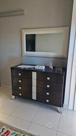 vendo camera da letto composta da: -letto matrimoniale in ecopelle e dettagli argento -comò in legno 4 cassetti - specchio con cornice in ecopelle -2 comodini in legno 2 cassetti letto già smontato pronti al ritiro