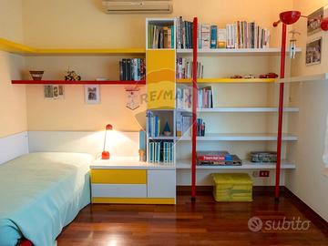 Camera da letto composta da armadio a 4 ante, comodino coordinato e mensole/libreria.