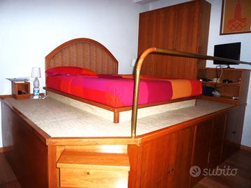 camera completa con letto posto su una pedana , armadio , sul davanti sono posti cassetti e sportelli , tre contenitori per biancheria e/o simili a scomparsa, ampio spazio sotto la pedana da usare come stanzino.