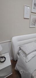 Letto matrimoniale imbottito con testiera alta e morbida rivestita in tessuto chiaro