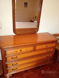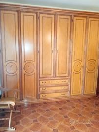 vendo camera da letto completa colore noce chiaro tenuta bene composta da letto matrimoniale, armadio 6 ante con 3 cassetti centrali,2 comodini, comò con specchio e 2 sedie in coordinato . lo smontaggio e trasporto a carico dell' acquirente prezzo leggermente trattabile