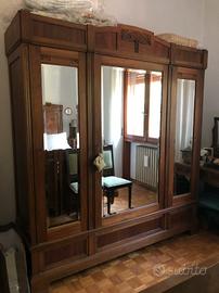 Vendo camera da letto composta da due letti singoli, armadio con tre ante con specchio, cassettiera con tre cassetti specchio e ripiano in marmo, due comodini con ripiano in marmo e toeletta con cassetti e specchio. Stile liberty fine '800 inizio '900 in legno di noce con motivi uguali su tutti i pezzi intagliati a mano da rinomato artigiano faentino. Tutto in ottime condizione. Ritiro a carico dell'acquirente