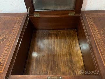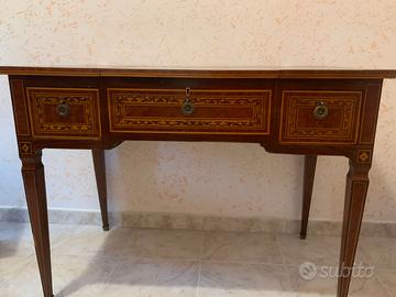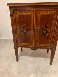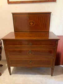 Camera da letto stile Maggiolini. Primi '900. Composta da giroletto alla francese, n. 2 comodini, n. 1 cassettiera a 3 cassetti con rialzatina, n. 1 toletta. Intarsio pantografato. Vendo anche singoli pezzi. Spedizione a carico dell'acquirente o ritiro in loco.
