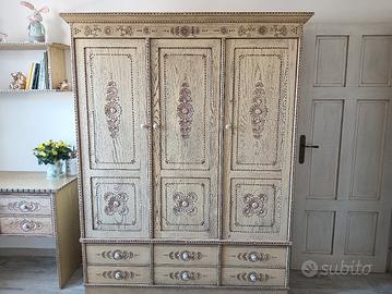 Camera con letto da piazza e mezza compresa di armadio, comodino, cassettiera scrivania e libreria interamente lavorata a mano nei minimibdettagli
