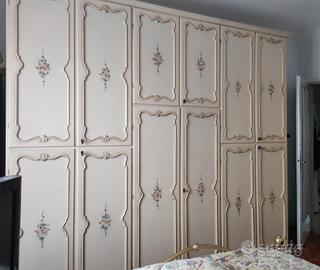 Graziosa camera da letto in legno stile veneziano, fine anni 70, colore avorio con piccoli fiori dipinti composta da armadio h 265x300x61, scrittoio 93x44xh100 struttura letto con reti singole praticamente nuove, ma senza materasso. Già smontata. Trasporto a carico dell'acquirente. Non si accettano transazioni estere, sblocchi per pagamenti con codici ecc. NO perditempo. Grazie