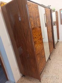 Camera da letto in radice di noce, pezzo unico, composta da: Struttura letto 2 comodini. Comò con 6 cassetti e specchio. Armadio 6 ante, di cui 3 specchiata.
