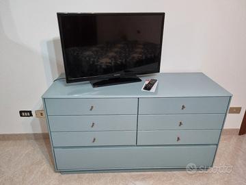 Camera da letto in legno di faggio laccato azzurro pastello, composta da letto solo struttura, cassettiera più specchio, 2 comodini. Usata ma tenuta bene.