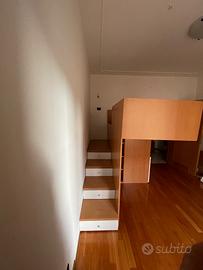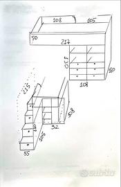 Vendo camera bambini unisex color legno in ottime condizioni, composta da letto rialzato e molto spazio per riporre abbigliamento, giochi, libri e molto altro. Una scala laterale permette un comodo accesso al letto, i gradini sono spaziosi cassettini e l’ultimo un cassettone. Sotto il letto altri 8 ripiani e 8 cassettini. In aggiunta anche grande piano per scrivania e 3 mensole. Mobile già smontato, ritiro in loco (Volano - TN).