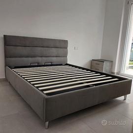 Camera da letto composta da: letto matrimoniale con contenitore, comò, n. 2 comodini, n. 2 abat jour. Letto con testiera in tessuto imbottita. Colori grigio antracite/grigio chiaro come da foto. Nuova mai usata.