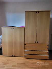 Camera da letto in legno composta da: 3 armadi a 2 ante, 1 cassettiera, 2 comodini, letto matrimoniale che può esserne diviso in 2 singoli.