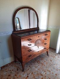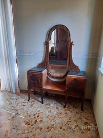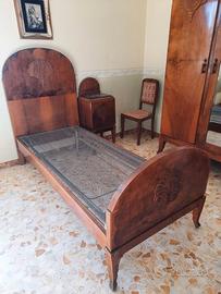 CAMERA DA LETTO VINTAGE ANNI '30 (ART DECO') IN RADICA DI NOCE COMPOSTA DA: ARMADIO 3 ANTE, 2 LETTI SINGOLI ABBINABILI, 2 COMODINI, COMO' E TOELETTA CON SPECCHIERA. VENDIBILI ANCHE SEPARATAMENTE. BUONO STATO.