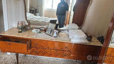 Vendo splendida camera da letto vintage anni ’60 stile Cantù, completa e originale, composta da: •Armadio 3 ante con specchi •Letto matrimoniale •2 comodini con piano in marmo •Comò con piano in marmo e specchiera originale Mobili in legno pregiato con lavorazioni a spina di pesce e dettagli intarsiati, tipici del modernariato italiano. Condizioni buone, con normali segni del tempo che ne attestano l’autenticità. Ideale per amanti del vintage o per arredare ambienti eleganti e retrò. 📍 Ritiro a mano 💰 Prezzo trattabile