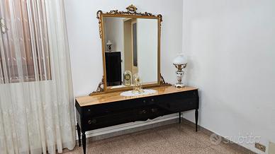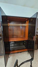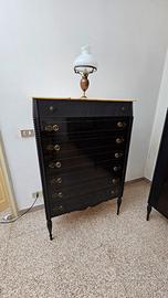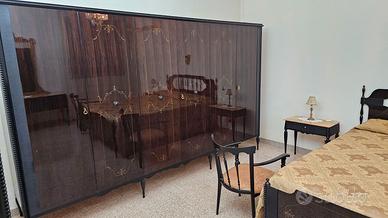 Camera da letto del 1965 laccata nera con decori e in legno di ciliegio completa. Letto - 170x205 cm Armadio a 6 ante con specchiere e cassettiera - 300x183x60 (LxAxP) Settimino con ripiano in marmo e 7 cassetti - 82x126x45 (LxAxP) 2 comodini con ripiano in marmo e cassetto - 58x37x32 (LxAxP) Comò con specchiera, ripiano in marmo e 4 cassetti - 179x71x48 (LxAxP) Specchio - 95x110 (LxA) - altezza cornice 125 cm 2 Poltroncine con imbottitura, seduta 38cm - 60x76x55 (LxAxP) No spedizione, solo ritiro e smontaggio da parte del compratore.