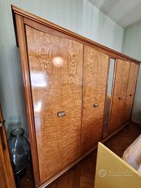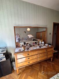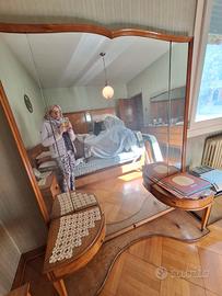 elegante camera da letto vintage completa, di produzione italiana, anni ’50/’60 circa, composta da: grande armadio guardaroba comò con ampia specchiera toeletta/specchiera da camera 2 comodini abbinati Il mobile presenta una bellissima impiallacciatura decorativa chiara, con linee armoniose e dettagli originali dell’epoca, come maniglie e piedini. L’insieme è molto scenografico, raffinato e perfetto per chi ama il modernariato italiano o desidera arredare con pezzi autentici dal fascino retrò. La camera è completa e coordinata, in buone condizioni generali, con normali segni del tempo compatibili con l’età. Ideale sia per utilizzo diretto sia per un eventuale restyling conservativo.