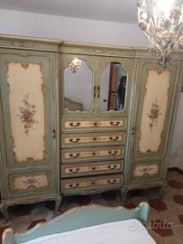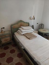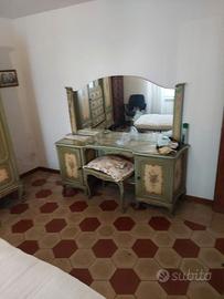 Bellissima camera da letto in stile veneziano antica, completa e ben tenuta. Armadio, letto singolo, comò con specchiera, tavolino con due poltroncine, lampadario.