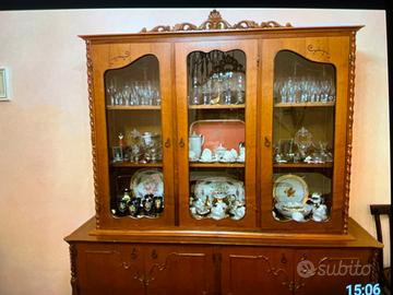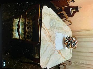 Svendo camera da pranzo in buone condizioni composta da tavolo in marmo con 6 sedie; vetrinetta per esposizione critalli e argenti; consolle in marmo con specchio. Ritiro in Napoli Bagnoli.