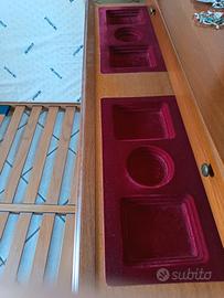 Camera da letto in legno completa di letto smontato con rete e un materasso, 2 comodini e una cassettiera con specchio.