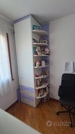 camera da letto Doimo con letto a soppalco scorrevole con due letti, con elemento a ponte con ante scorrevoli, scale con contenitori. Armadio contenitore c/ante e 4 cassetti di colere bianco e inserti lilla