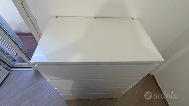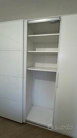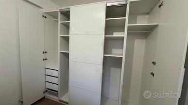 Vendo camera completa IKEA, acquistata a fine 2021 e mantenuta in condizioni pari al nuovo. Tutti i pezzi sono in perfetto stato, senza graffi, scolorimenti o difetti. ARMADIO IKEA PAX Misure Larghezza: 250 cm Altezza: 238 cm Profondità: 66 cm Composizione: 2 moduli centrali con ante scorrevoli in vetro bianco 2 moduli laterali da 50 cm con ante a battente Interni completi: ripiani regolabili, bastoni appendiabiti, vari cassetti LETTO IKEA MALM + DOGHE LEIRSUND Misure: matrimoniale standard 160×200 cm Inclusi: Struttura letto MALM bianca Doghe LEIRSUND (con molle ammortizzate, più confortevoli) COMÒ IKEA MALM – 3 cassetti Colore bianco Ampia capacità Scorrimento cassetti perfetto Nessun difetto Top in vetro bianco Note: Ritiro e smontaggio a carico dell’acquirente Visionabile senza impegno Si considerano anche proposte per il solo armadio a 400 €