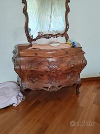 Armadio (per abiti e uno con ripiani+ cassettoni) , cassettiera, specchio sedie poltroncine e comodini in stile barocco intarsiato legno noce.