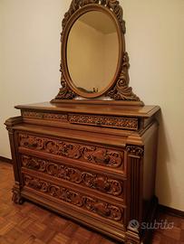 Bellissima camera matrimoniale in stile classico e di qualita', composta da ampio armadio a 6 ante con 2 antine a sopralzo e 2 ampi cassetti, con specchio alle porte centrale. Abbinato como' da 3 cassetti e 2 secretaire superiori con specchiera. Inoltre due comodini con ripiano inferiore e 2 cassetti + letto a doghe in legno regolabili con testiera e pediera in pendant misura standard 180x200 (non visibile nell'inserzione in quanto gia' smontato) Il tutto in perfette condizioni. Misure in cm: Mobile H. 264 Lungh. 300 Prof. 62 Como' H.96 Lung. 127 Prof. 53 Specchio H.100 Lung.100 Comodino H.60 Lung. 69 Prof. 34 Smobilizzo con urgenza causa cambio alloggio Trasporto e smontaggio a Vs carico