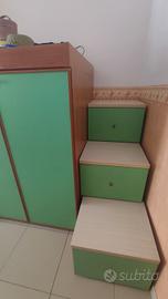 Provvista di due ampi armadi, uno sopra il letto ed uno accanto. Possibilità di aggiungere un terzo letto sotto quello in foto, visto che funge anche da divano letto. Scala laterale per raggiungere il letto superiore. Non è provvista di materassi, disponibile solo una rete.