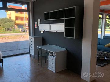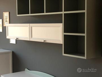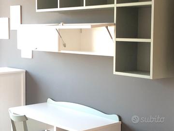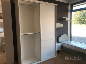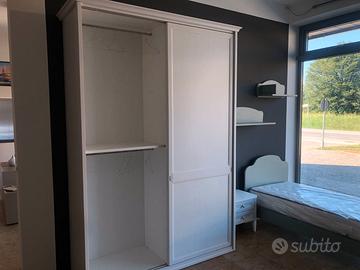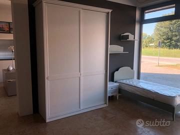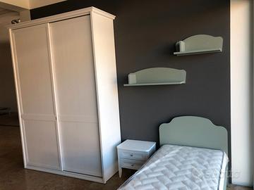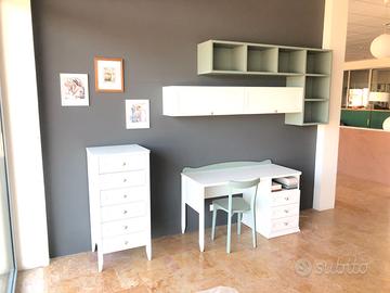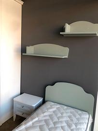 Camera letto FEBAL CASA COLOMBINI linea ARCADIA composta da comodino e settimino country, sedia noemi, libreria sospesa colore agave, pensili cm 90, letto per rete e materasso da cm 90, mensola omega da 65 cm e 95, armadio largo cm 190 con cassettiere interna.