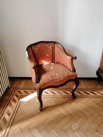 Camera da letto completa stile Chippendale primo Novecento, con letto matrimoniale, 2 comodini, armadio 3 ante, petineuse con sedia, 2 poltroncine con rivestimento da sostituire e comò con specchio. I mobili sono attualmente smontati. Ritiro a carico dell'acquirente
