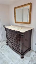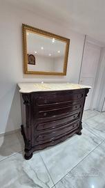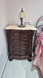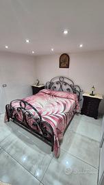Vendo splendido arredamento completo per camera da letto in stile classico, ideale per chi cerca qualità artigianale e materiali nobili. I mobili sono in condizioni eccellenti, perfettamente conservati. Il set comprende: 1. Letto Matrimoniale in Ferro Battuto Design ricercato con lavorazione artistica a riccioli e volute. Struttura solida e robusta che comprende sia la testata che la pediera coordinata. Un pezzo intramontabile che dona eleganza e leggerezza visiva alla stanza. 2. Trittico in Legno Pregiato e Marmo Il trittico (composto da un comò e due comodini coordinati) rappresenta il cuore dell'arredo: Comò: Ampio e capiente con 4 grandi cassetti. Struttura in legno scuro con rifiniture intagliate sui lati e piedini lavorati. Coppia di Comodini: Coordinati al comò, dotati di 4 cassetti ciascuno, perfetti per organizzare al meglio lo spazio. Piani in Marmo: Tutti e tre i pezzi del trittico sono completati da un piano superiore in vero marmo sagomato color crema/beige, che conferisce pregio e resistenza. Dettagli aggiuntivi: Pomelli in metallo brunito originali. Stato di conservazione: Ottimo (legno lucido e marmo integro). NOTA BENE: Lo specchio visibile nelle foto e la biancheria non sono inclusi nella vendita. Informazioni per il ritiro: I mobili si trovano a Napoli Centro Il trasporto e lo smontaggio sono a carico dell'acquirente. Data la presenza dei piani in marmo, si consiglia un trasporto adeguato per evitare urti. Prezzo richiesto per l'intero blocco: 2000€ TRATTABILE Disponibile per ulteriori foto o per visione dal vivo su appuntamento. Massima serietà.