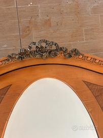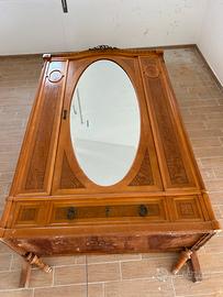 Camera da letto fine 800 primi 900, come da foto completa di letto con testiere, collegamenti laterali, comodino, comó 4 cassetti e specchiera regolabile, armadio con specchio e cassetto. In ottime condizioni ad esclusione del piede armadio come visibile da foto.
