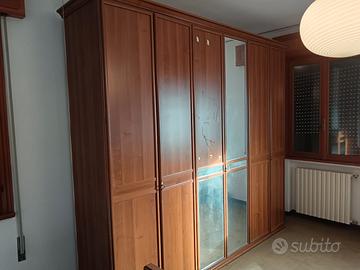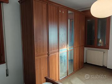 Camera composta da letto matrimoniale con rete , due comodini, comò con specchiera, armadio sei ante il tutto color noce. Come nuova, solo ritiro smontaggio e trasporto a carico dell'acquirente.