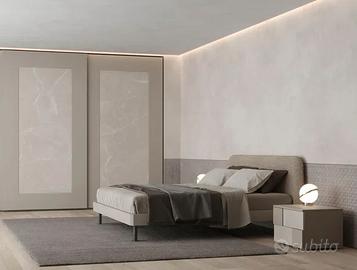 -Letto POUF: giroletto in nobilitato e testata imbottita (tessuto o ecopelle). Piede in ferro H. 28 (L. 205 x P. 212 x H 100 cm).