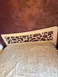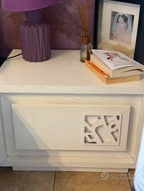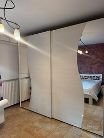 La camera e composta da letto matrimoniale in legno massello verniciato bianco e dí decorazioni su la testata.due comodini bianche con casette e un armadio con porte scorrevoli e specchio integrato.il manofatto e stato realizzato a mano vendo per cambio mobilio